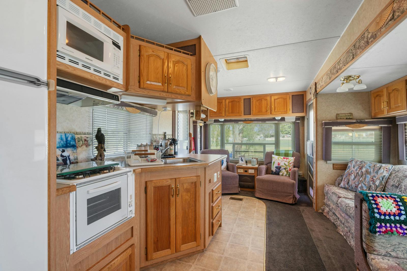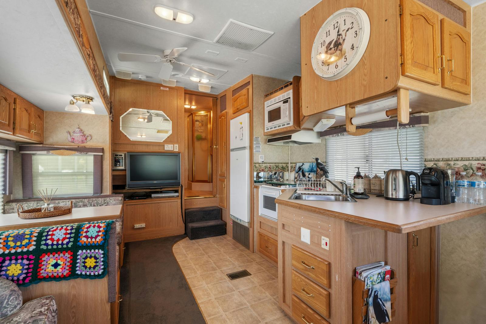 • Single sink, gas cooktop with rangehood, gas oven, microwave, fridge/freezer, coffee machine, electric frypan, and air fryer