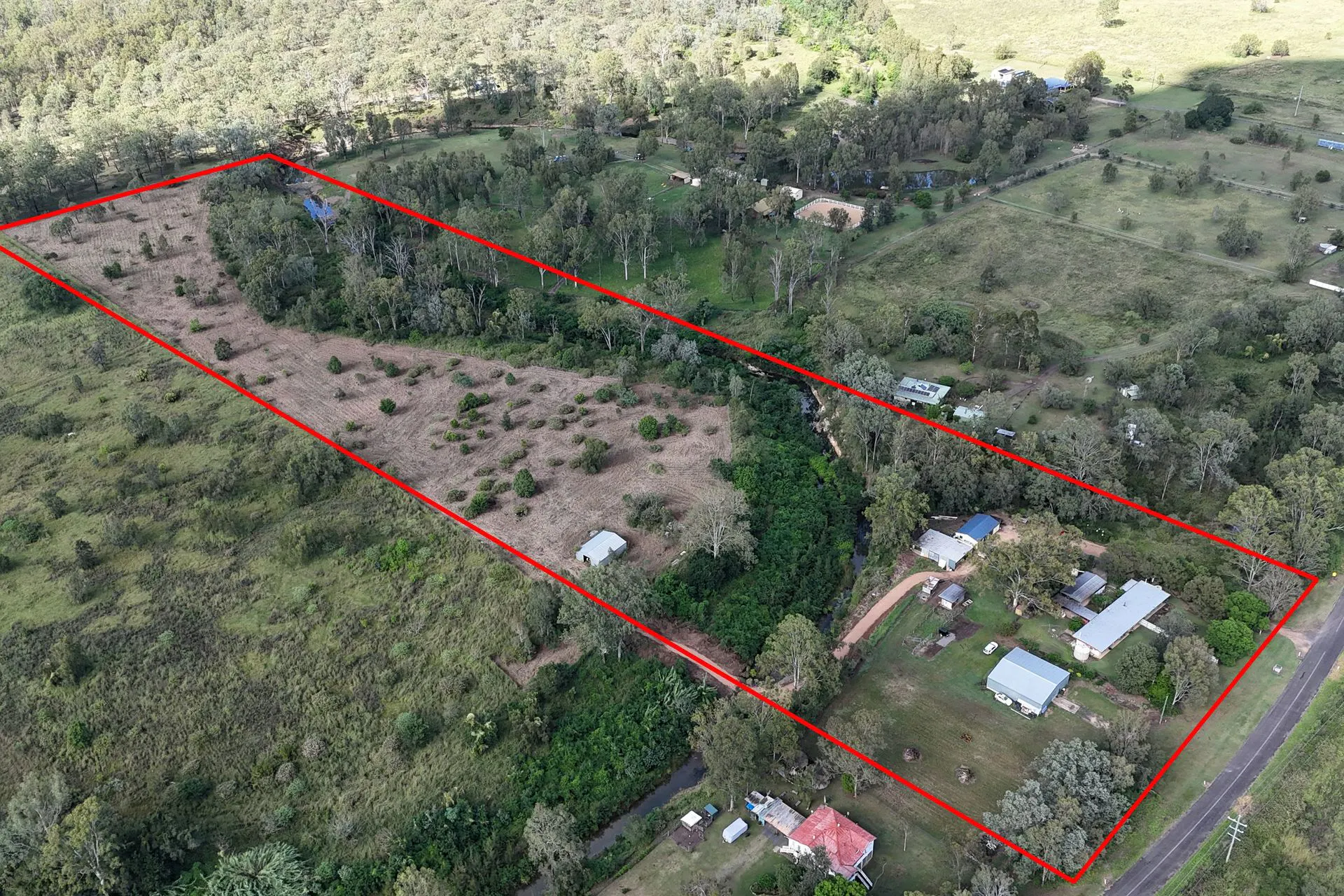 A permanent natural watercourse winds through the property, enhancing both landscape appeal and agricultural water supply. The balance of land offers gently undulating country with well established pasture for livestock, or horses, or recreation. With this blend of open grazing country, shaded timber and riparian vegetation, the property delivers both lifestyle amenity and practical acreage function.