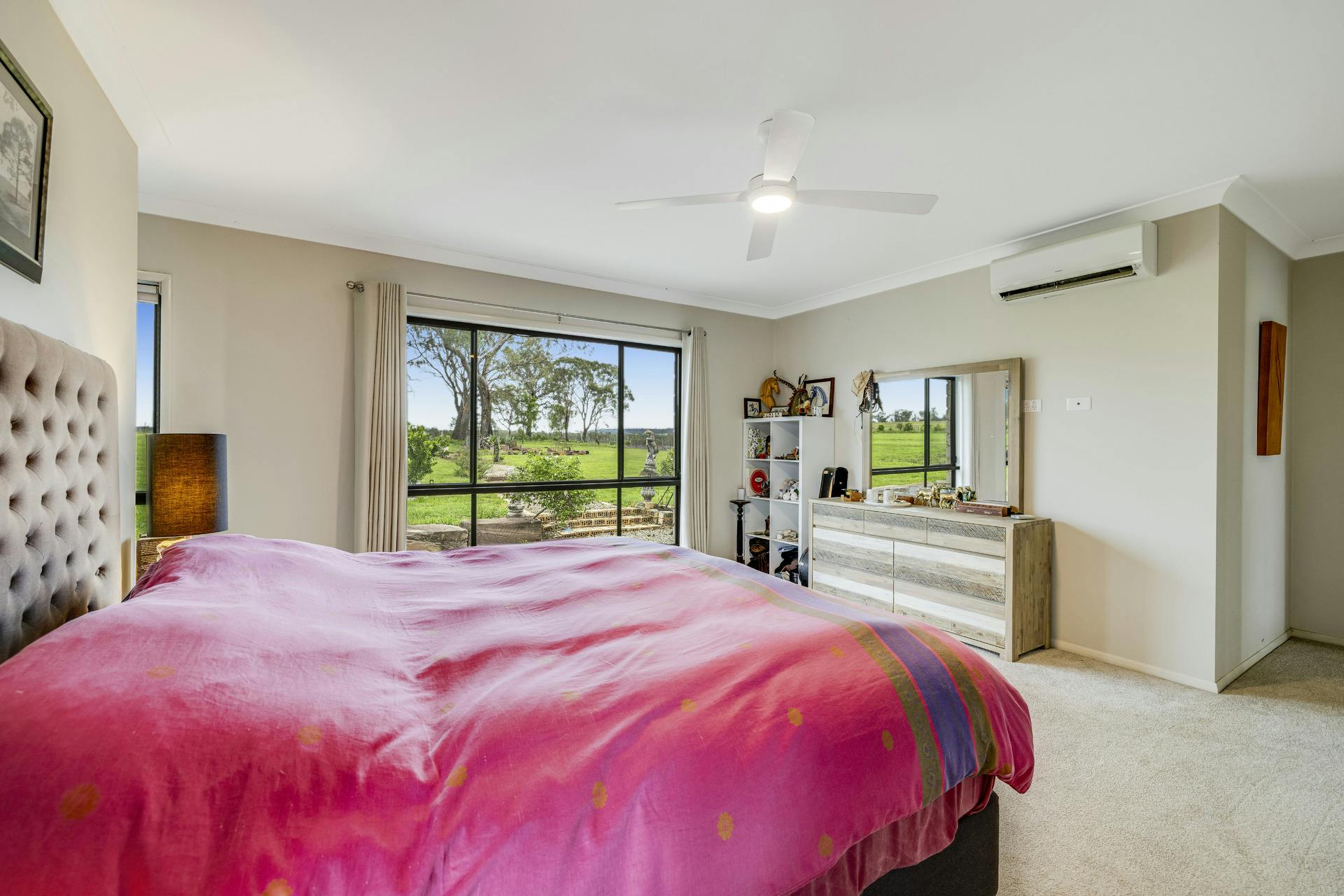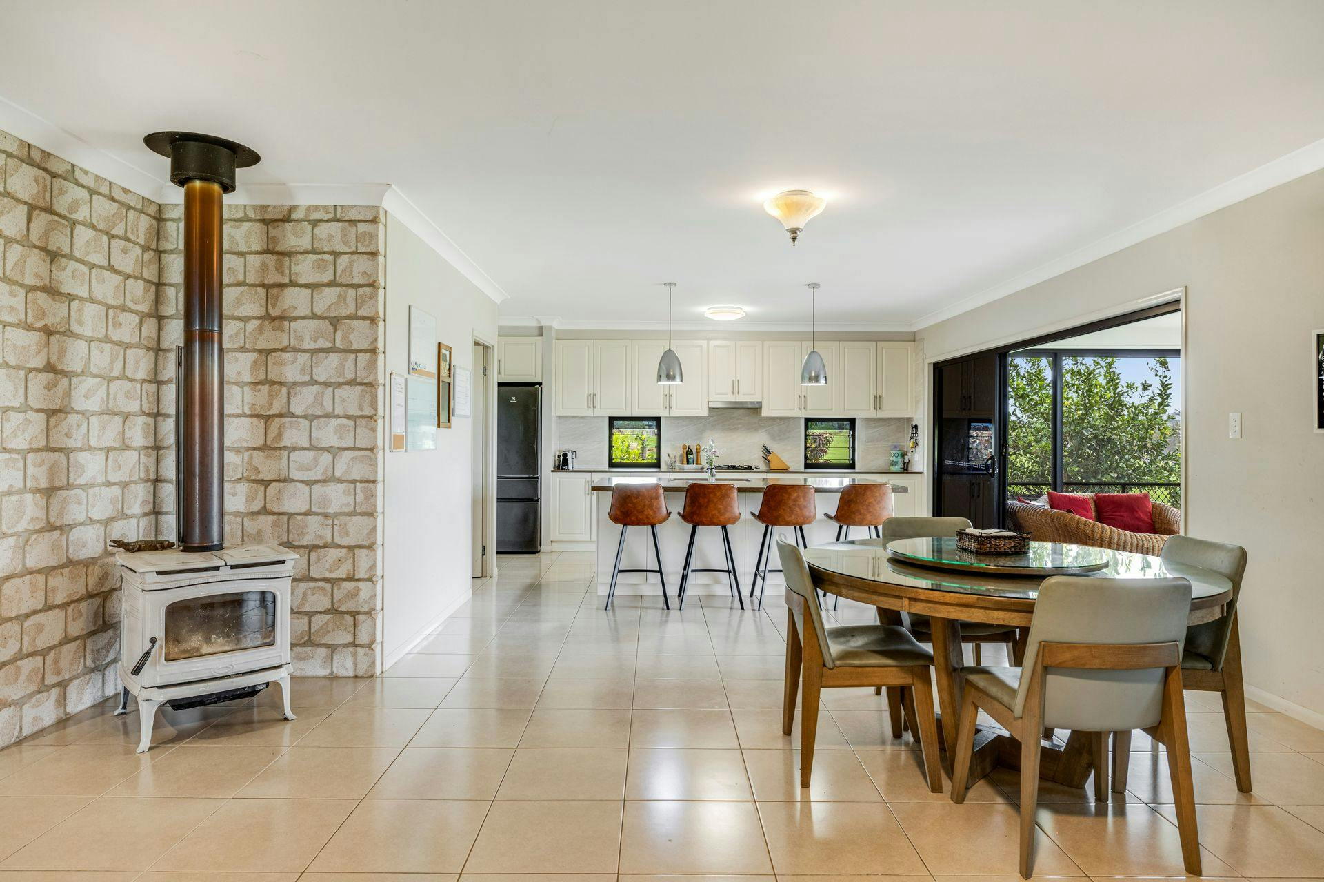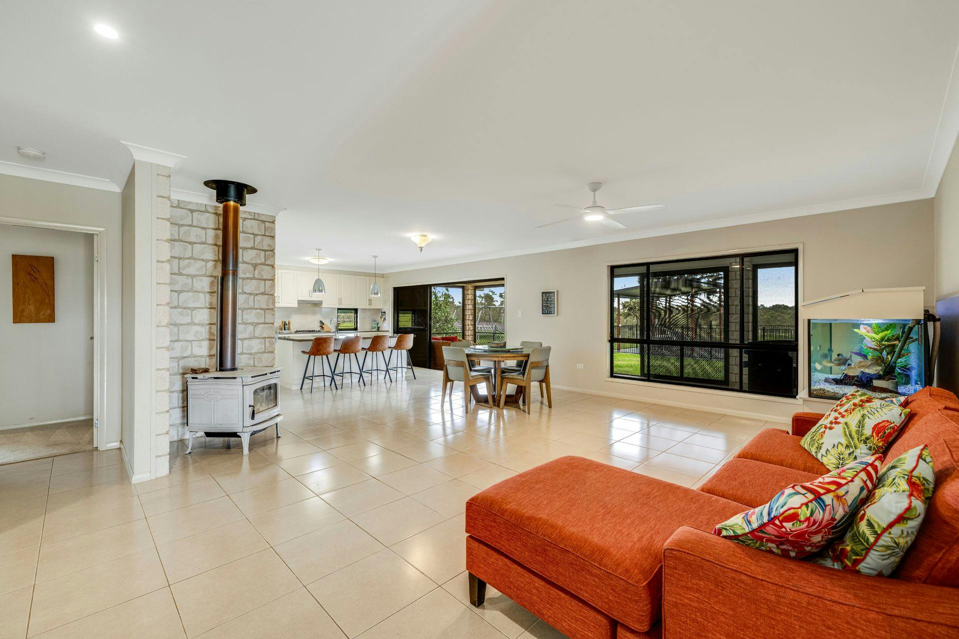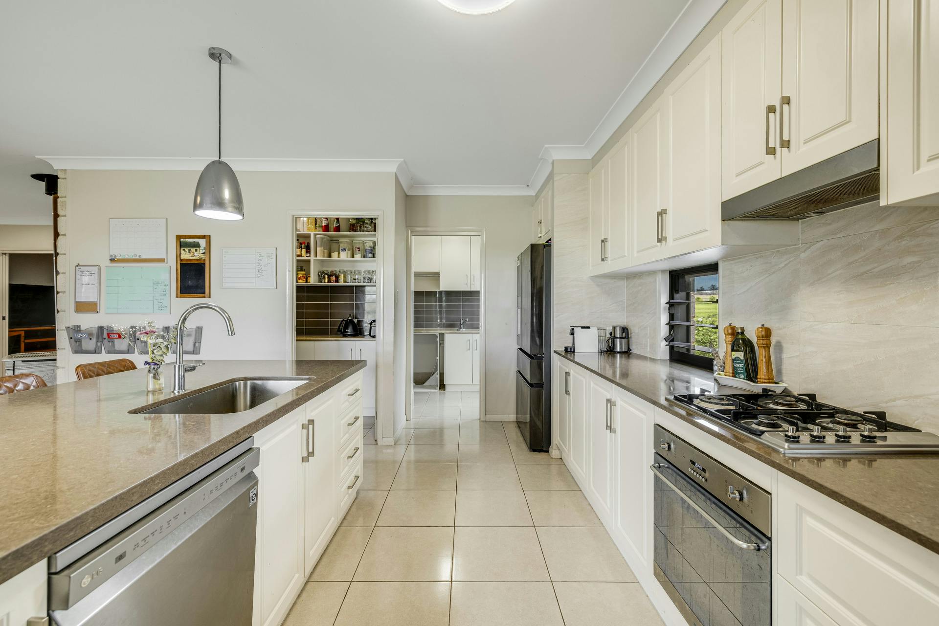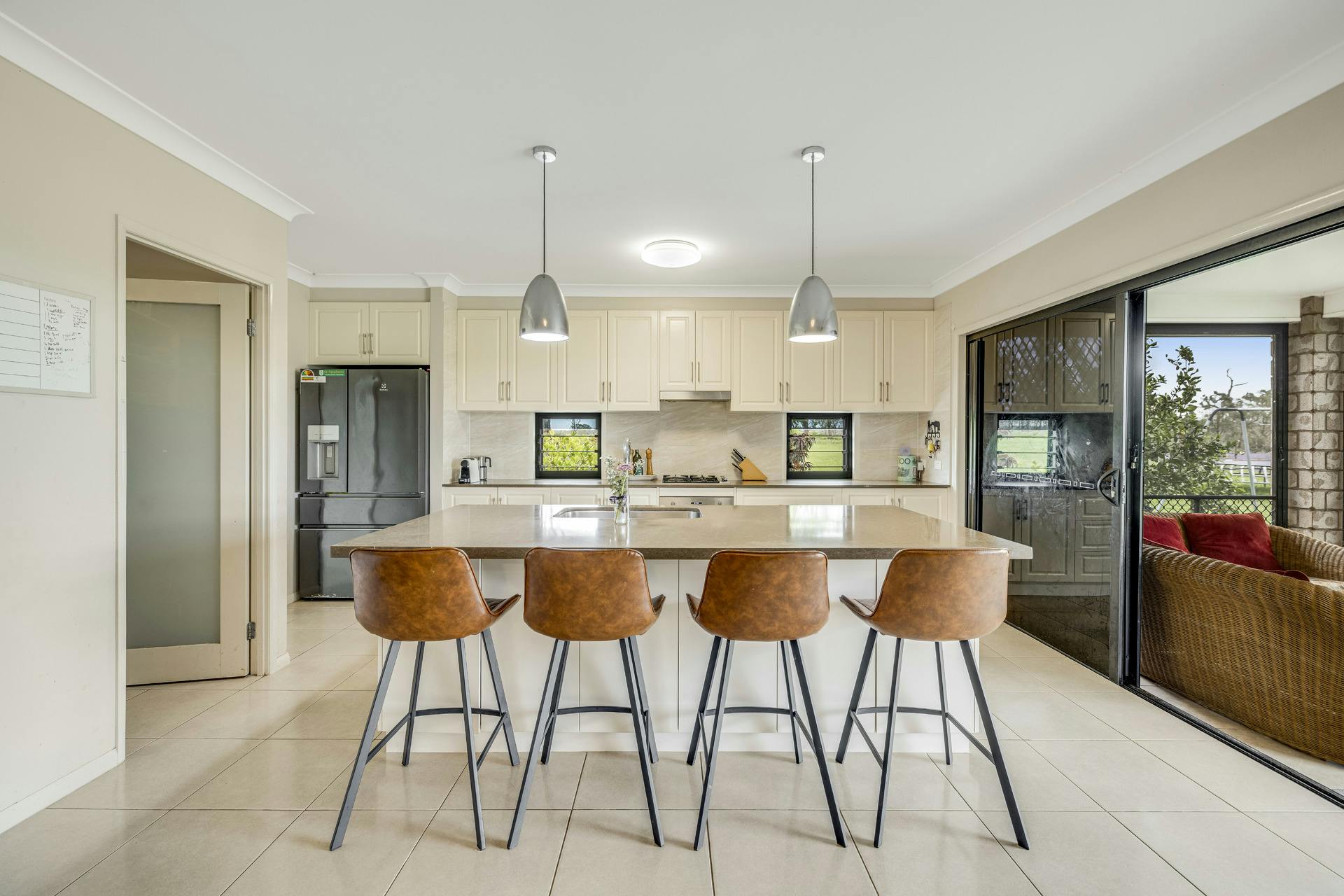 The spacious galley kitchen has a big wide Caesar Stone Island bench featuring a commercial size sink and full-length breakfast bar. Plenty of bench and cupboard space with beautiful splash backs and featured louvered windows, together with a large butler's pantry, quality electric oven and gas cooktop, rangehood and dishwasher make this kitchen a fabulous practical workspace and hub of the home. It has a beautiful Northeast outlook to and beyond to the pool area.