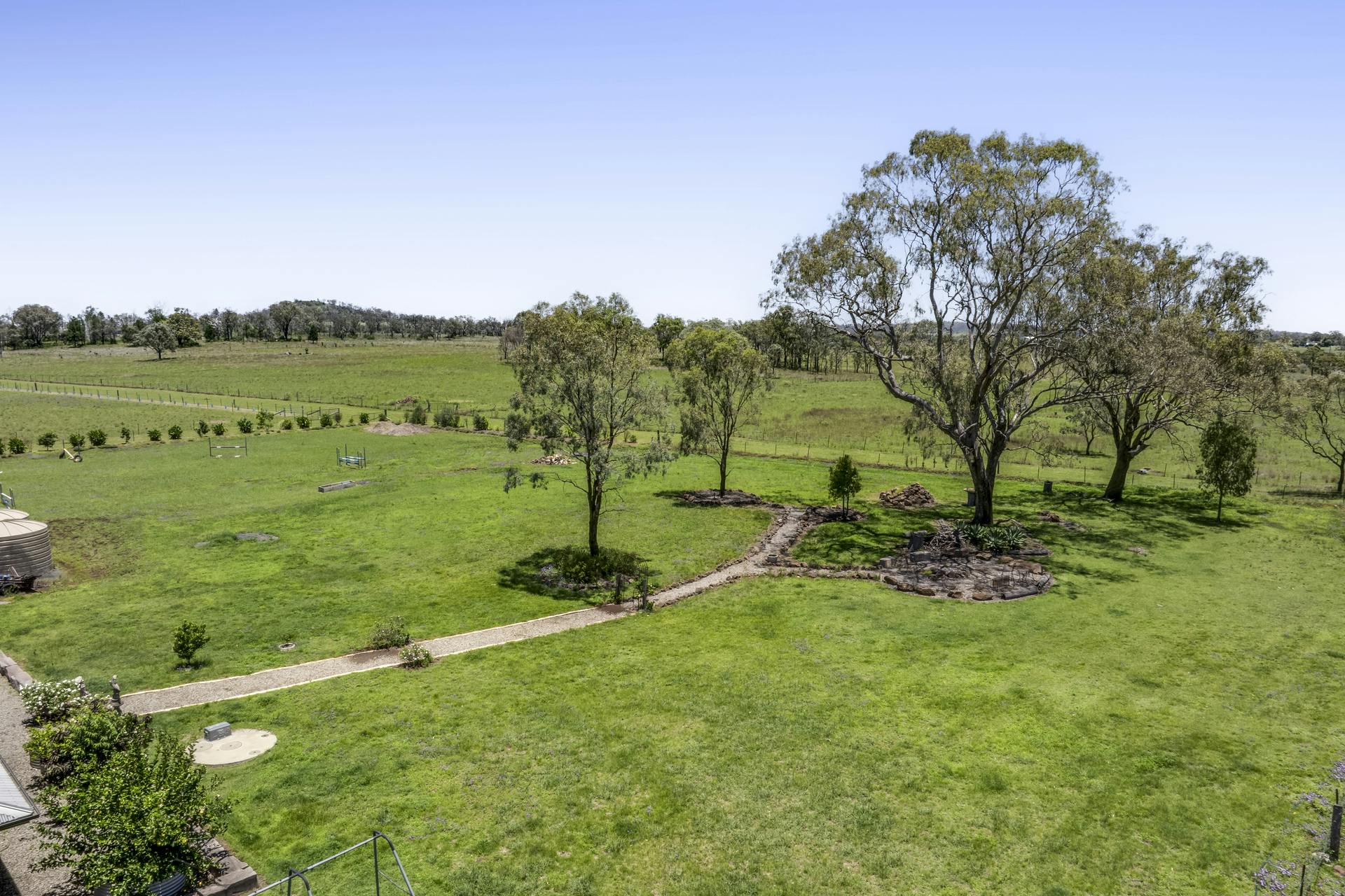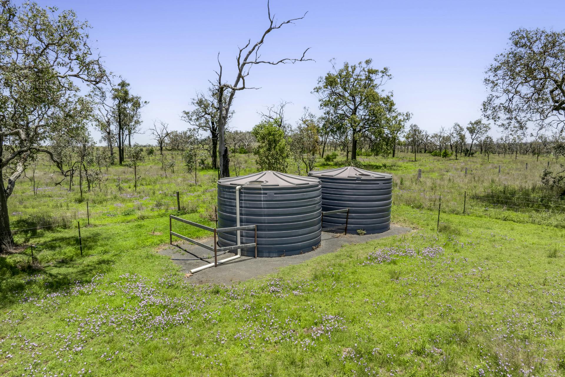 • A Stock & Domestic Bore in the form of a well serviced Windmill pumping approx. 200 litres or more per hour up to two 5000 gallon elevated header tanks, gravity feeding down a network of lines watering troughs and trees. Four x 5000 gallon interconnected poly tanks collect rainwater off the home, and a further two x 6000 gallon connected tanks collect from the large shed, supply the whole home.