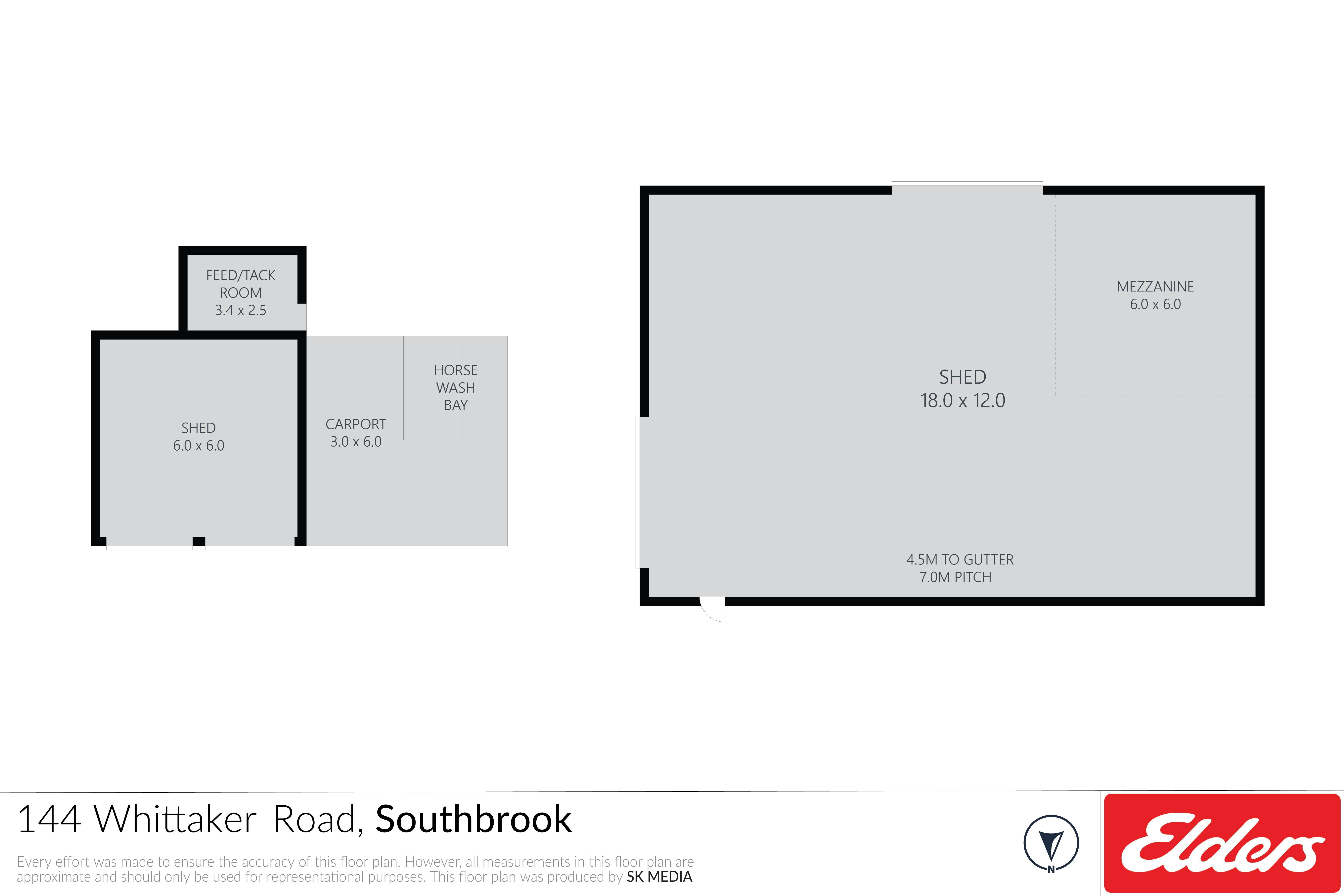 • R&F Built Shed is 18m long x 12m wide, with 4.5m height to the gutter, a 22° pitched roof and 6.2m high at the peak. Two 4.2 m high clearance doors are 4.93m and 4m wide respectively, & mezzanine floor is approx. 6.5 x 6m in size.
