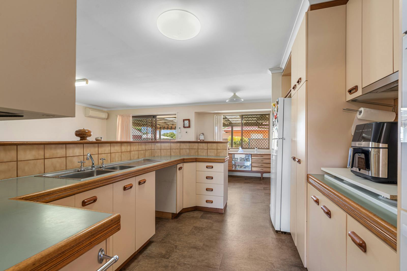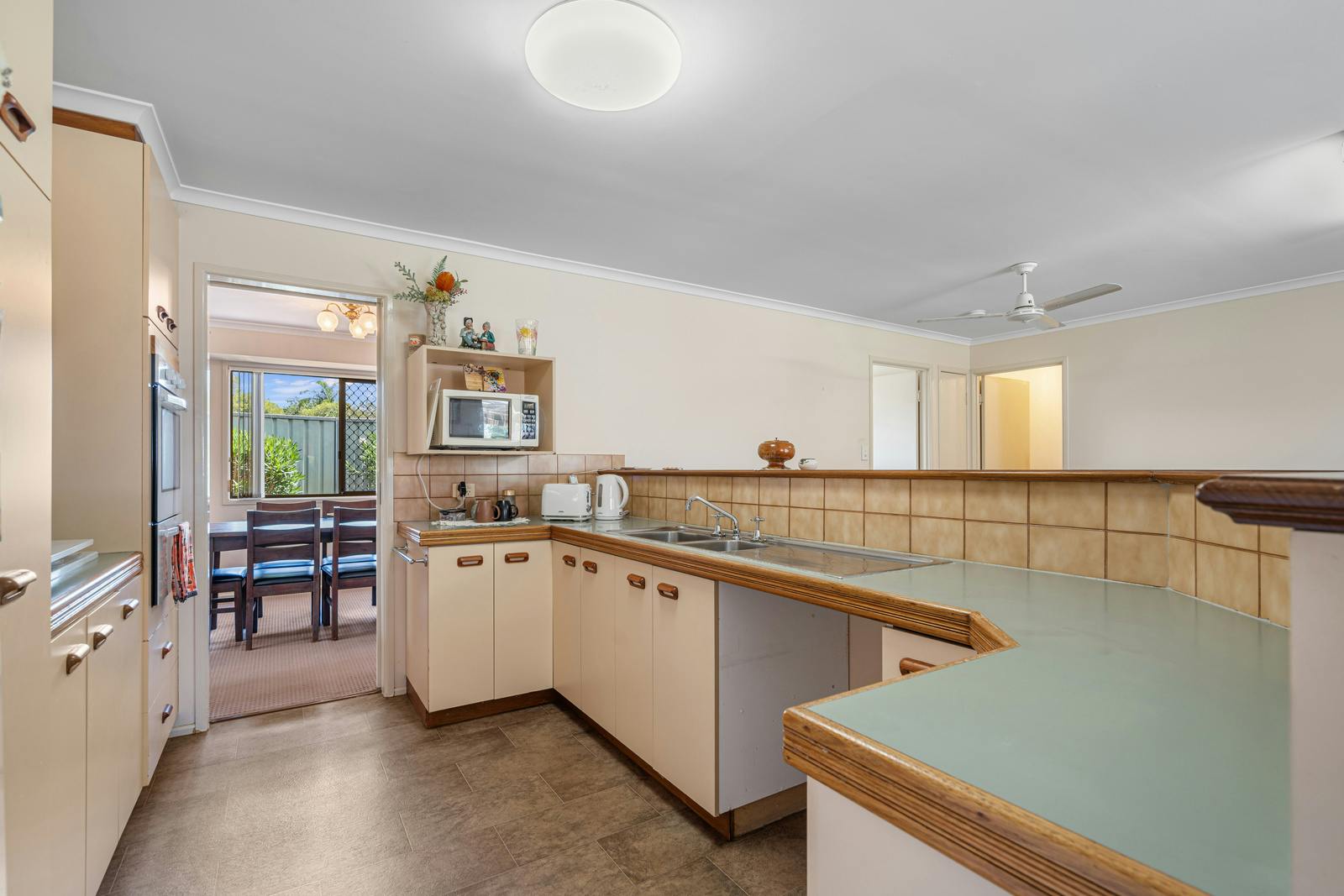 The well-appointed kitchen sits at the heart of the home, offering ample cupboard space, a large fridge cavity, electric cooking, double sink, and easy access to both living zones.