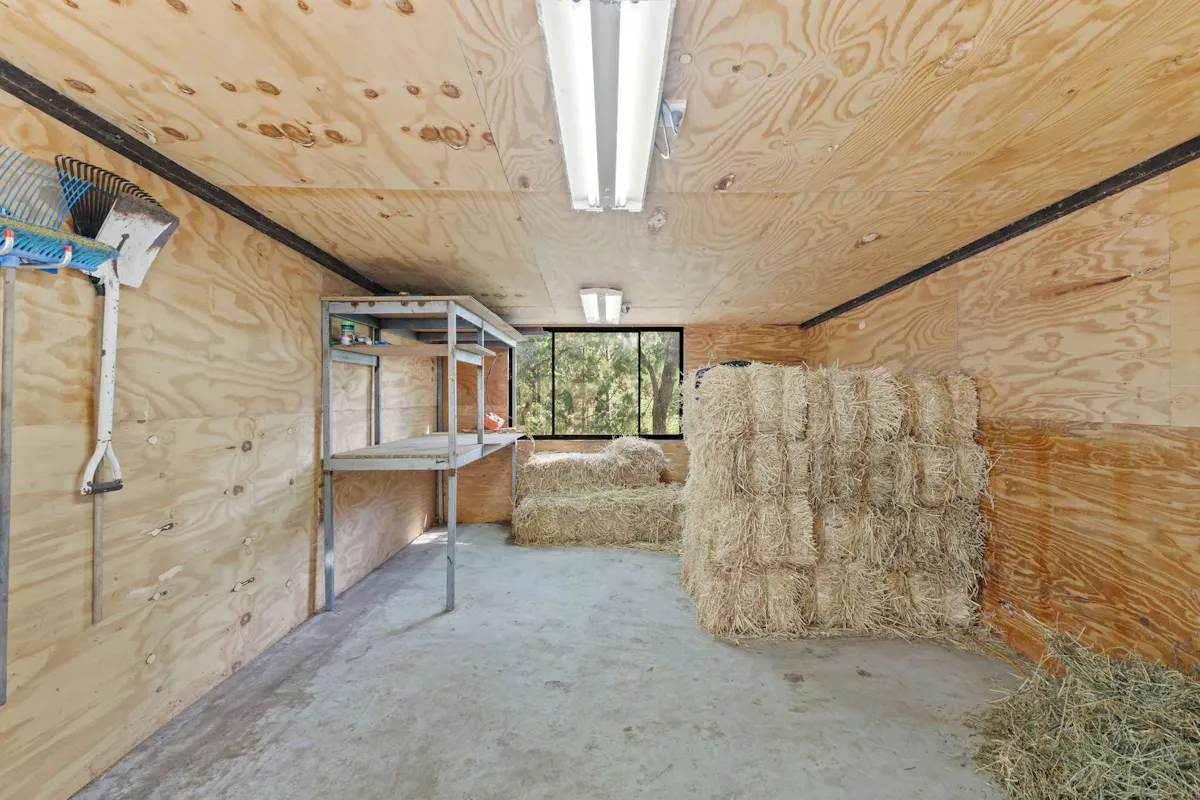This complex provides three covered WIWO large 6m x 6m loose boxes with insulated ceilings. In the centre of the stables is a 6m x 4m mouse proof feed room with concrete floor. Power water and lights to all these areas.
